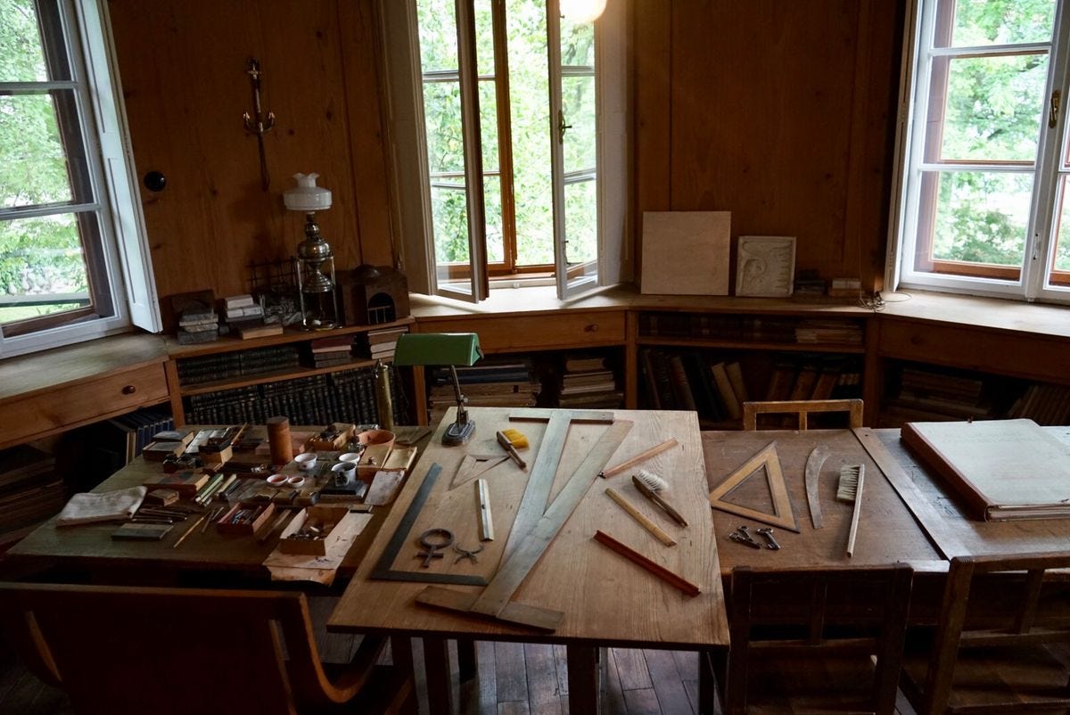 A dream drafting desk inside the Ljubljana home studio of Slovenian architect Jože Plečnik. (“The house is marked by the master’s constant research spirit and asceticism, and many an architectural experiment turned out to be the right solution for his later work. In his report to Suhadolc, Plečnik himself calls his house an ‘experimental hotbed.’”)